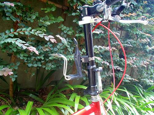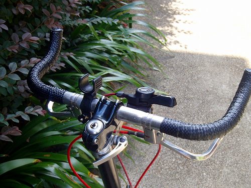 今まではシートポストに付けていましたが、ハンドルポストに移動しました。実は、このボドルゲージを付けるパーツは位置変更の為にゲージを外す必要があります。という事は輪行する度にゲージを外すという面倒な状態です。場所的にはシートポストがよかったのですが、ハンドルポストに移動させました。