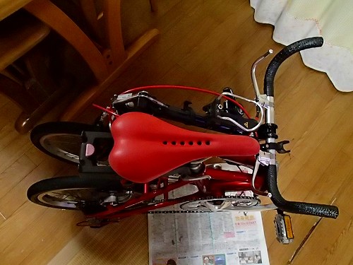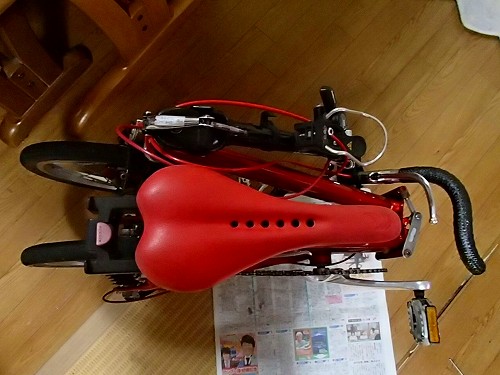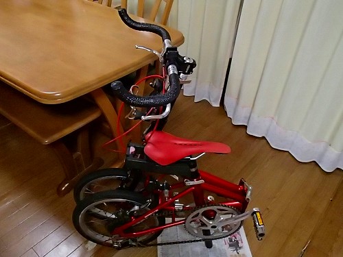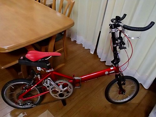 DAHON独自の方法で、フレームをぱきっと折り曲げます。ちゃんとシートポストとタイヤで自立してくれるので安心ですね。ちょっとだけふらつく場合は手袋をタイヤの下に挟んでおくと安定するみたいです。これまでは車載しかしなかったので、この状態で運ぶ事しかありませんでした。