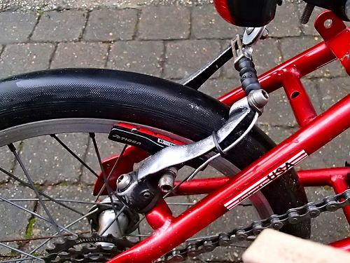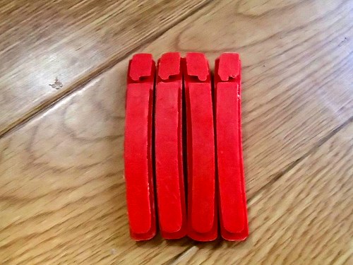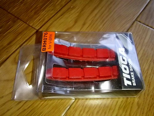 次はブレーキシューの交換です。かなり前に、購入しておいた、タイオガのブレーキシューを使います。今度のブレーキシューは赤にしました。ブレーキの汚れって黒いイメージが強いですが、シューの色が赤いとどうなんでしょうね?赤い汚れもちょっとこわいな。