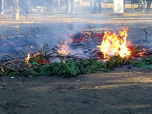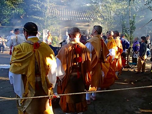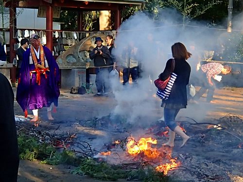 近づくと、山伏みたいな人がいっぱいいます。この人達が渡るんだろうな?と思っていると、おねーさんが裸足で渡って行くじゃないですか!!あ、、熱くないのか?この手前では白い山をふみふみしている人が居ましたので、お清めをしているんでしょうね。てっきり、山伏姿の方々が火渡りするのを見るイベントだと思ってましたが、一般の方が渡るんですね。この人だかりは見る人ではなく、火渡りの順番待ちをしている方々でした。100人以上の老若男女、、小さな子どもまで並んで楽しそうです。