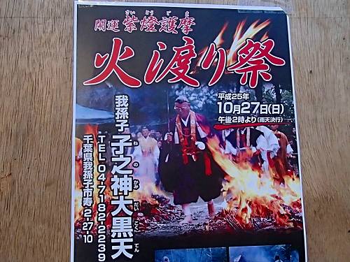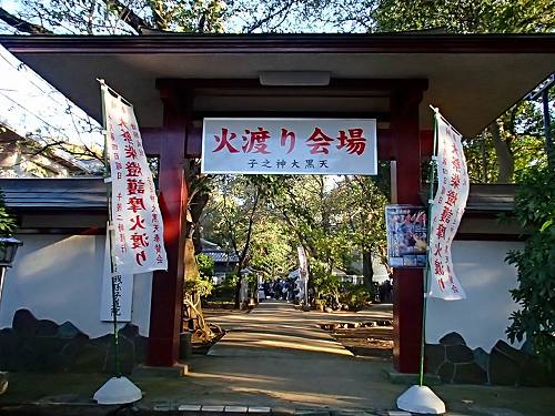 着いた場所は、「子の神大黒天」でした。いつもと違う道だったので到着するまで全然わかりませんでした。なんだか奥の方にはすごい人だかりが見えますが、山門には「火渡り会場」と書いてありますね。そういえば、以前来た時にネットで調べた覚えがありますが、偶然にも今日が火渡り祭りの日だったようです。