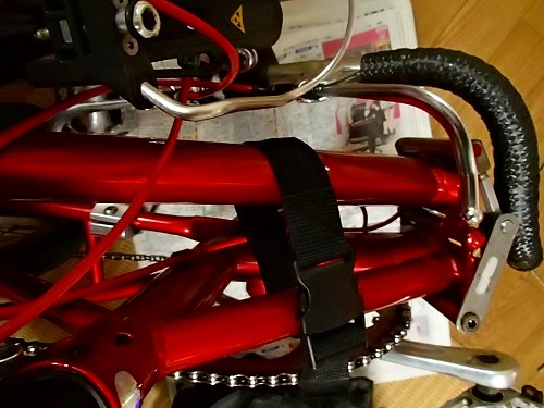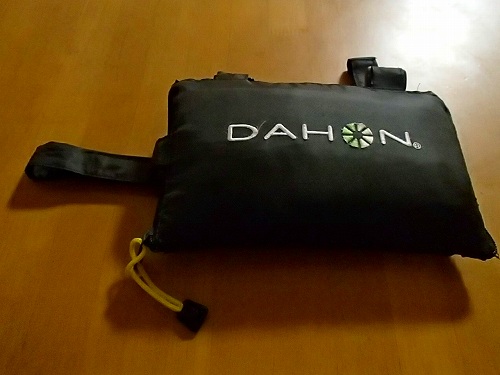 これまで、DAHONは輪行するつもりがなかったので、シフターやボトルゲージの場所はあまり考えてませんでしたが、一旦折りたたんでみて、影響のない場所に移動してあります。今後はこの場所が定位置ですね。スリップバッグはこのようにシートポストとサドルにぶら下げる事ができて便利です。DAHONのロゴがいいですね(笑)