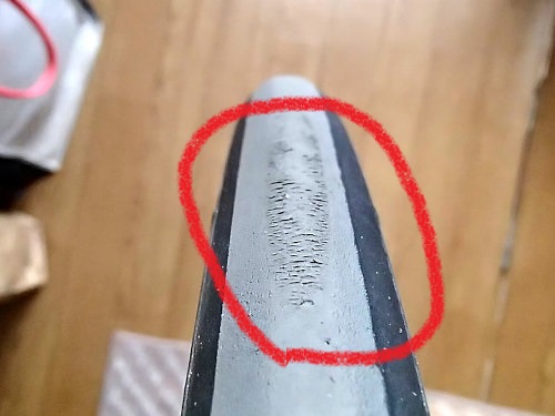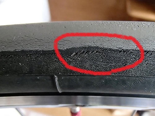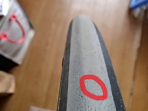 右:赤い丸のところは急ブレーキでロックさせた時にできたんでしょうね