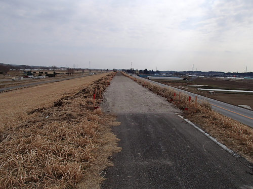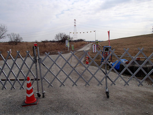 河川敷はMTBコースの先でなくなるのですが、その先に砂利道がずっと続いています。いつもは工事の気配はないのですが、この日はパイロンがいっぱいあったり工事車両が出入りした形跡がありましたので、何か工事をしているのでしょう。