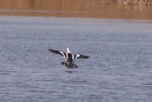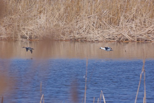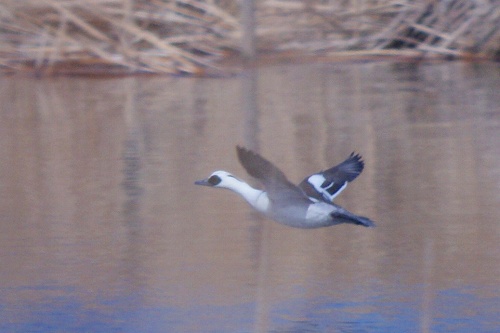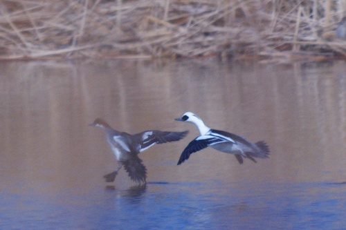 2羽のカモが並んで飛んできましたので、連写!!ちょっと白いような気がするけど、もう一羽は赤いよな〜と思ってたのですが、目の前まで来たらミコアイサでした。お!この赤いのはメスですね。どうも、つがいだったみたいです。