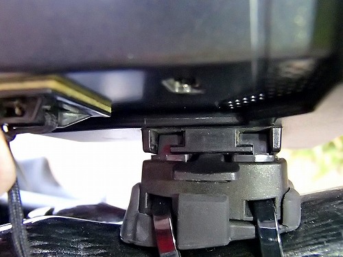 覗きこむと、ちゃんとレバーはあります。このレバーを下げてホルダーを向こう側にずらすと外れるのですが、ホルダーが向こう側にずれる気配がしません。でも、レバーを下げると下がってます、、、あれ?白い先は何?折れた??