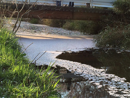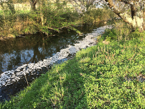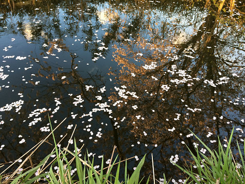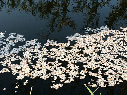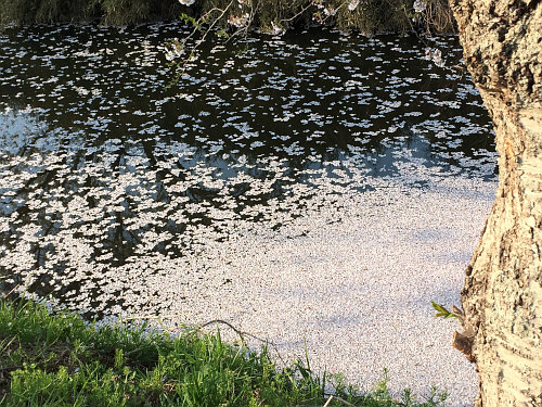 右:実は下流側からは風が吹いていて、橋と橋の真ん中あたりで、上流から流れてくる花びらを堰き止めていました。この画像が丁度境目辺りです。