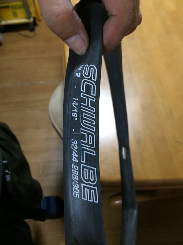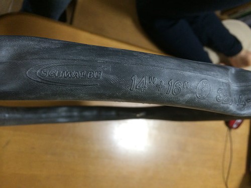 前輪はこんな感じでバルブの場所に亀裂が入っていました。新品のチューブなので、劣化とかはないはずなんですけどね〜。バルブアダプターを付けるために、前後輪ともに外したところ、パンクしなかった後輪のチューブは最初から(シュワルベ No.3 16インチ*1.75ー2.5)だった事が判明!もしかしたら、チューブが小さい事も要因の1つかもしれませんね。(でも、タイヤも16*1.5なのでピッタリのはずなんですけどね)