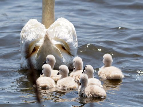 親の羽根が綺麗!子供たちの頭が、、、中学生の坊主頭のようでカワイイです。