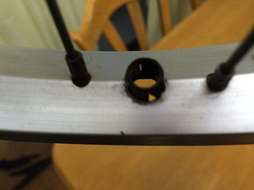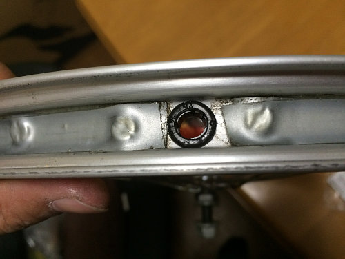 バルブアダプターはダブルウォールリム用になっていて、ハト目のようにリムの内側から差し込むように出来ているのですが、DAHONのホイールはシングルウォールリムなので、反対側(タイヤ側)から差し込んで使いました。こうしておけばチューブに負担もないし、抜けてしまうこともないでしょう!