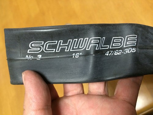 左:交換用チューブ(シュワルベ No.3 16インチ*1.75ー2.5)