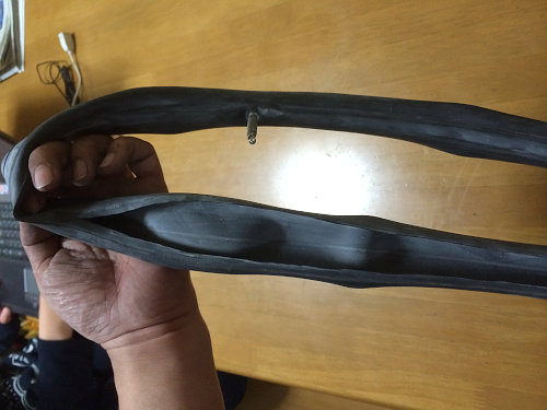 パンクしたチューブはこんなことになってます。よくあるチューブをリムに挟んだ時に起こるバーストみたいになっていますね。ですが、今回はタイヤが大きいので噛みこむ事はありませんし、手だけですんなりタイヤが入ったので挟んだという事もないです。しょうがないので、予備のチューブに交換し、無事作業を完了しました。次の朝(5月2日)に撮影した交換後の写真がこれです。