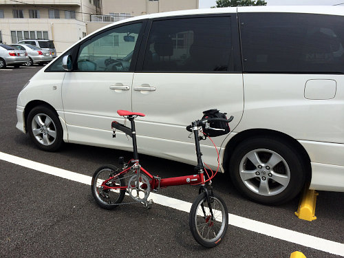 家族を送り届けて、駐車場でDAHONを降ろします。昔、NARUTOの映画を見に行く家族を送って、同じようにDAHONを下ろしたらパンクしていた事がありましたが、今回は大丈夫です(笑)