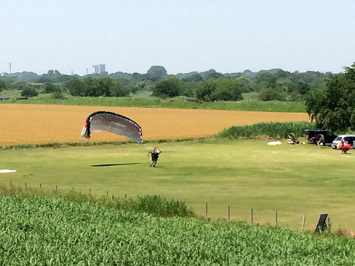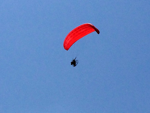 無風状態の利根川CRでは、モーターパラグライダーも気持ちよく飛んでいます。練習中の人もいたようで、こんな感じで離陸練習をやってました。