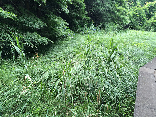 途中で見つけた不思議な光景です、向こうからこっちに水が流れるように草が倒れています。大雨なんて降ったっけ???