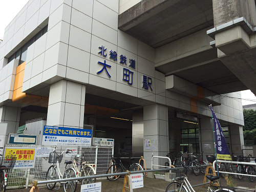 この先を右に曲がって、どんどん進むと、、北総鉄道の大町駅に到着しました。