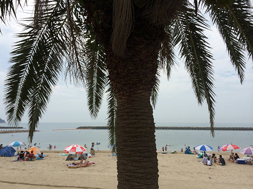 次の日は海でシュノーケリングが目的だったので、南あわじの阿万海岸海水浴場へ向かいます。いつもはもっと近くの超遠浅海水浴場で遊ぶのですが、今回はほぼ大人だけの参加だったので、和歌山と同じようなスズメダイとかが見られる海岸まで足を伸ばしました。おじーちゃん達はこの樹の下で涼んでいます。