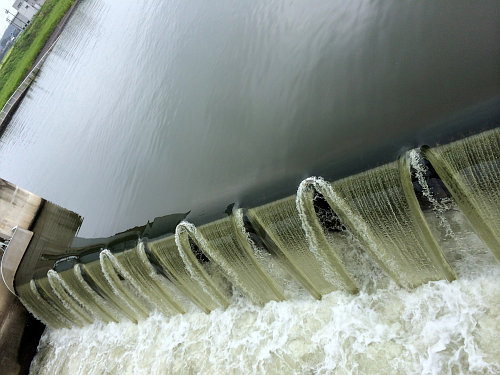 左:ザーザーと音を立てながら流れる堰の水