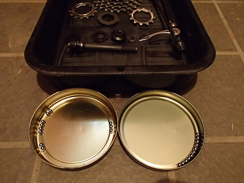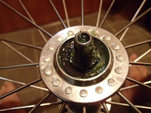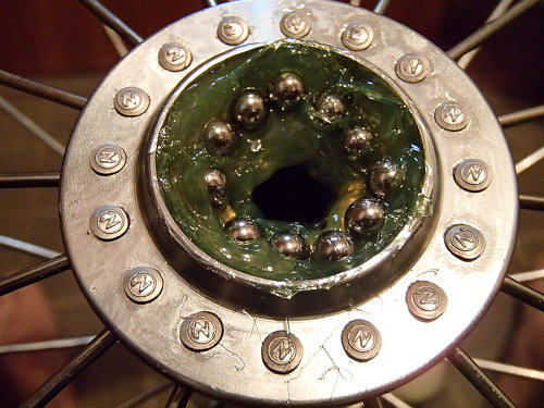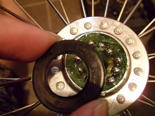 こんな感じでグリスにベアリングを乗せて、この後からもグリスを入れて押し込みます。TIAGRAのハブには蓋みたいなのが付いているので、これをはめてから、ハブ軸を通して、玉受け(ベアリングを抑えている部品)を取り付けてから、いい感じに調整します(最初、このいい感じがわからなくて大変だったなー)。