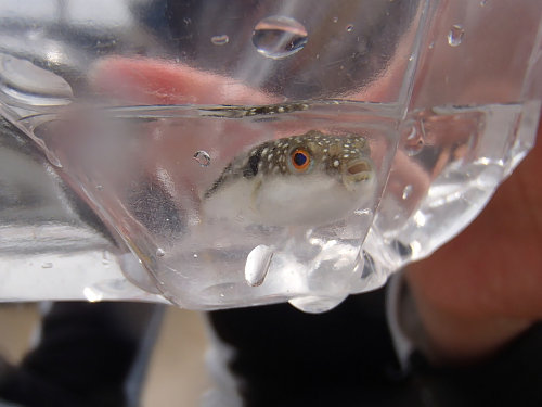 透明度が売りだったはずなのですが、台風の影響で見えない(悲)しょうがいないので磯でヤドカリと遊びます。親子連れがふぐを捕まえていましたので、写真を撮らせてもらいましたが、ふぐも淡路の名産なんですね。