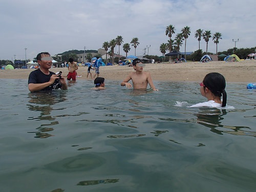 左:子供たちと付き添いの半子供は海でシュノーケリング