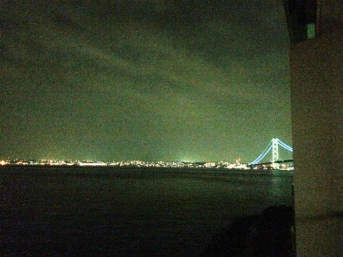 右:ライトアップされた橋と明石の町並み