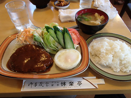じゃーん、美味しそうでしょ!!美味しかったでーす。ハンバーグが柔らかくって、サラダがいっぱいで大満足です。玉ねぎの中で半熟になったタマゴをどうしていいか?迷いましたが、ハンバーグと一緒に食べて大正解でした。そうそう、このご飯は半分です。みなさんの定食のご飯があまりにも盛りが良かったので、急遽半分にしてもらいました。ヨカッターーー最後で(笑)