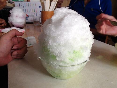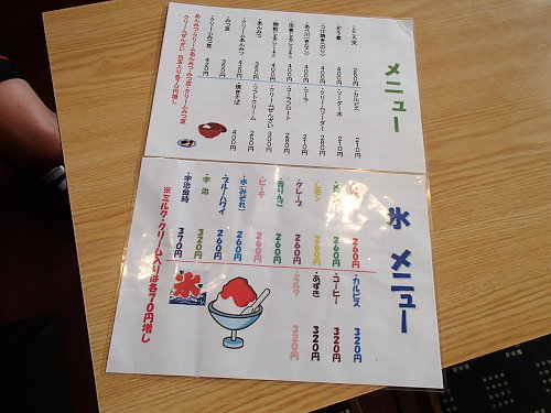 すごいでしょ!手の倍以上あるかき氷(青りんごミルク)です。おばちゃんが運んできた瞬間に全員が「えーーーー!260円だよね??」って叫んでましたよ(笑)。頭がキーンとする事もなく美味しくいただきました。(いつも、ガリガリ君でキーンとなるんですけど、僕だけ大丈夫だったのは何故でしょうね?)