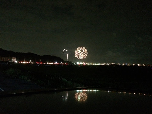 左:iPhoneで撮影して、綺麗にたんぼに写った花火