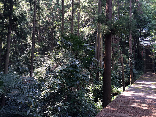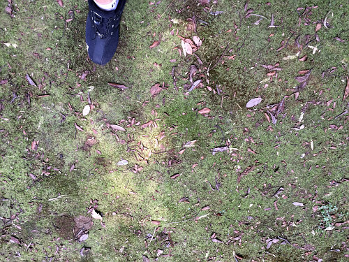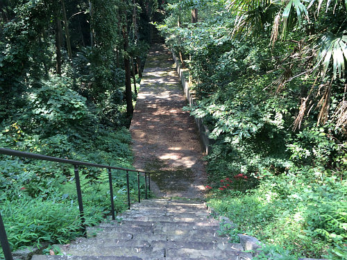 階段をそっと降りて、ふと足元を見ると、こんなに苔が生えています。さらに、枯れ葉もいっぱい積もっていて、しばらく誰も歩いていない感じで、気のせいか涼しいです(よかった霊感とかなくて)