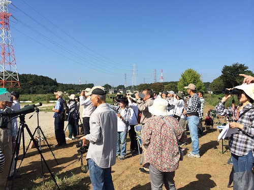 野田市清掃工場の周辺が鷹の渡りスポットです。利根運河の生態系を守る会さんの企画への参加なので、既にたくさんの方々が既に集合していました。近づくと「あそこにサシバが5羽」「取手から15羽行きまーす」とか無線で交信しながら渡り情報が入ってきます。ん?取手で見えるの?我孫子では??見えるかも(笑)