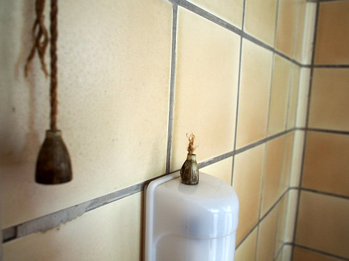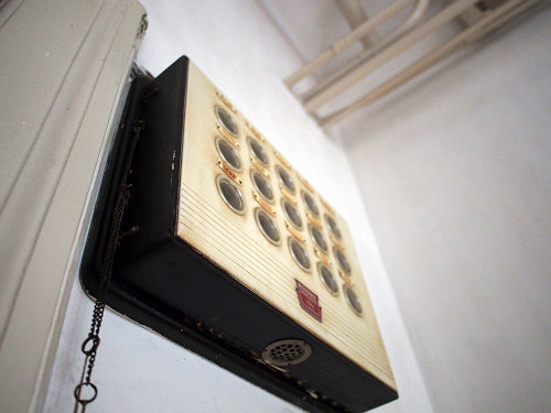 左:誰かが壊した換気扇??、右:ファミレスみたいな呼び鈴システム