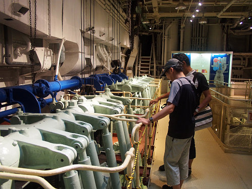 そして、最も、楽しかったのが、、、船底です!!機関室に入ることができるのですが、予想をはるかに超える巨大なエンジンが鎮座していました。ピストンは何メートルあるのか?わかりませんでしたが、バルブ調整用のシャフトをドライブシャフトと間違ってしまうくらいでかいです。