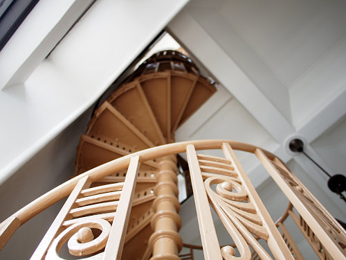 左:階段の飾りがカワイイです、右:ブルータイルの洗面台