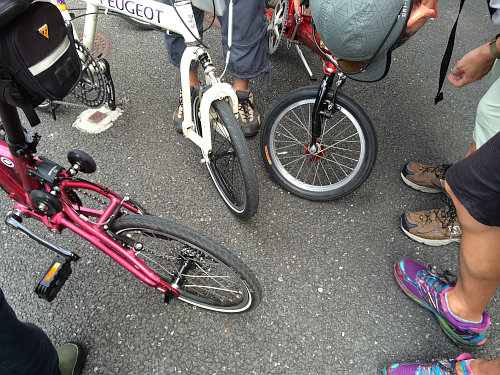やっぱり僕のが一番小さいですね。でも、はんぞうさんの16インチの方がBD-1の18インチより大きく見えるのは何故でしょうか??少し自転車談義してから出発です。