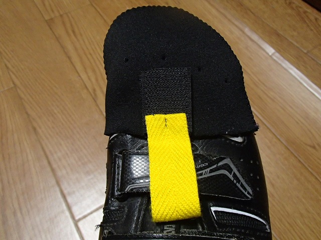 マジックテープで靴に止めてしまおうという事を考えていたのですが、使っているSPDシューズはマジックテープで止めるタイプですので、このマジックテープに止めてしまえばいいかな?と2週間くらい前に嫁さんに発注してました。