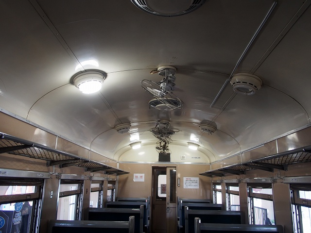 展示には客車もあって、中はこんな感じにレトロです。なんとなく昔乗ったJR山陽本線に似ていますが、天井が丸くてたかーいのはSLに会ってるのかもしれません。