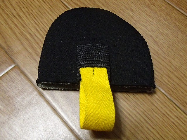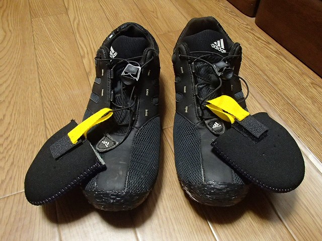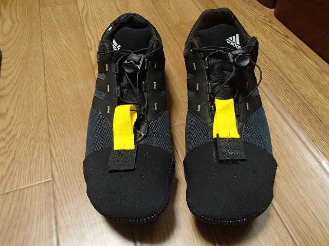 で、出来上がったのがこれです。このトゥーウォーマーはワークマンで300円だったかな?(本来は作業靴の中で、靴下の上につけるものですが、靴の外でもOKです)マジックテープは値段知らないんですが100円くらいでしょうかね?ちゃんとマジックテープで取り付けられます。