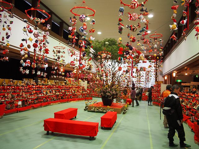 お雛様つながりで、ひなまつり企画をやっている「久保講堂」です。不思議な建物ですが、この建物も寄付されたものなんですね。入ってみてびっくり!立派なお雛さんがいっぱい飾ってあり、天井からはつるし雛が大量につるされていて、迫力に圧倒されながら見学します。