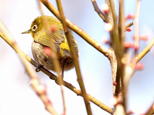 すぐちかくの杉村楚人冠記念館の庭に寄ります。できたばかりの時は野鳥撮影によく来ました。ついたら梅が咲いていていい香りがしていますので、ベンチに座って日向ぼっこしますが、あまりにもメジロがうろうろするので、ピントを合わせる練習をしてみました。