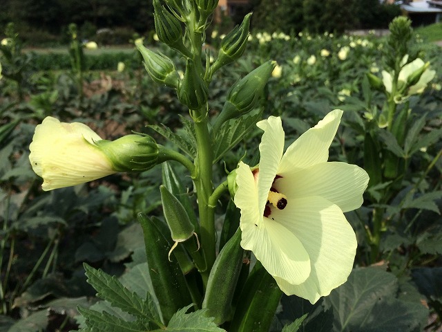 今日は久しぶりに晴れという事で、午前中に野鳥ポタに出かけました。微風が吹いていて気持ちいいですが、なぜか鳥の気配があまりないんですよね。途中で、立派なオクラの畑を通ったのですが、この間の宴で10さんがオクラの花が食べられる話をしていたので、停まって撮影してみました。さすがプロですねオクラいっぱい!!うちの玄関でできたオクラは3つだけだった(笑)やっぱり1つの花に1つの実のようですね。花を食べるという事は実にはならないという事なので花を食べるのは勇気が要ります(笑)
