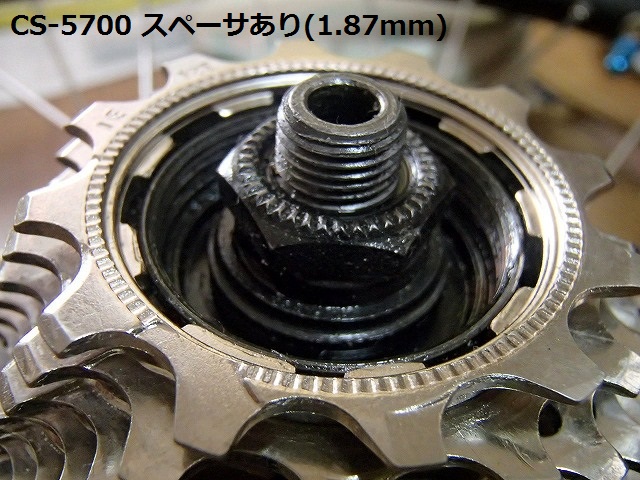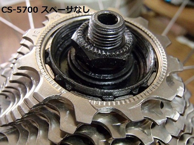 交換後の105のスプロケを嵌めた状態です。ロースペーサをつけていないとこんなにフリーボディが飛び出してしまうのです。これではロックリングをつけてもスプロケはカタガタと上下してしまいます。そこでロースペーサをつけてからスプロケを嵌めるとフリーボディが飛び出しません。これでロックリングをつけてスプロケを固定する事ができるんですね。