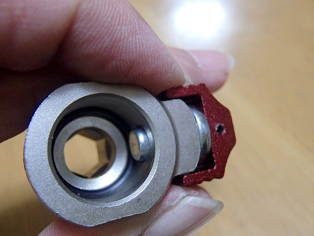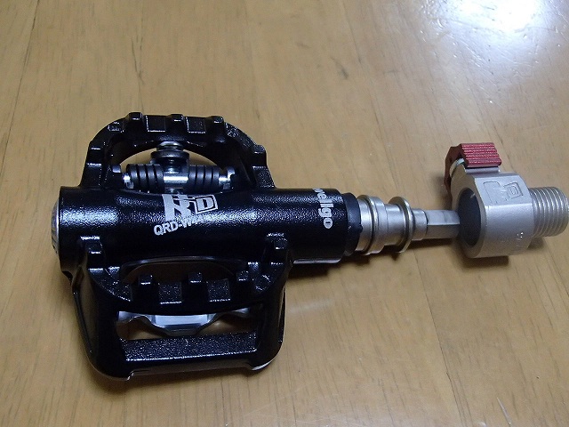 こうやって赤いパーツを動かすと突起がへこむのでペダル軸が外れます。単純といえば単純な構造なんですが、分かったら安心ですね。
