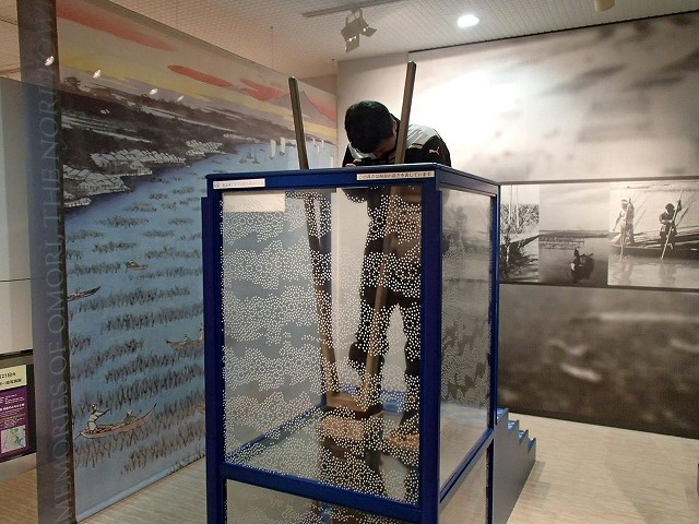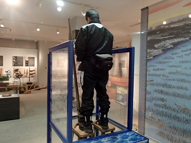 のりの養殖はこういう簾にのりをイメージしますが、今回驚いたのはこの「ひび建て」です。海の中にのりをつけるためにほうきのようなものを指していくのですが、この水深の場所に高下駄を履いて作業します。高下駄が脱げたらと思うと怖いですね。