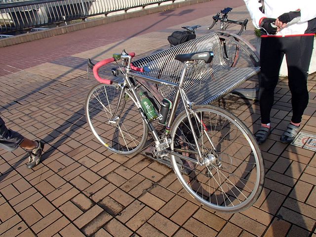 愚兵衛さんはさすが早くて一番乗りです。輪行のまっちさん、IWAさんも到着されてました。僕たちが最後だったんですね〜。愚兵衛さんの自転車には不思議なサドルが付いてましたが、最近はやりなんですね〜。(サドルの高さが羨ましい〜)