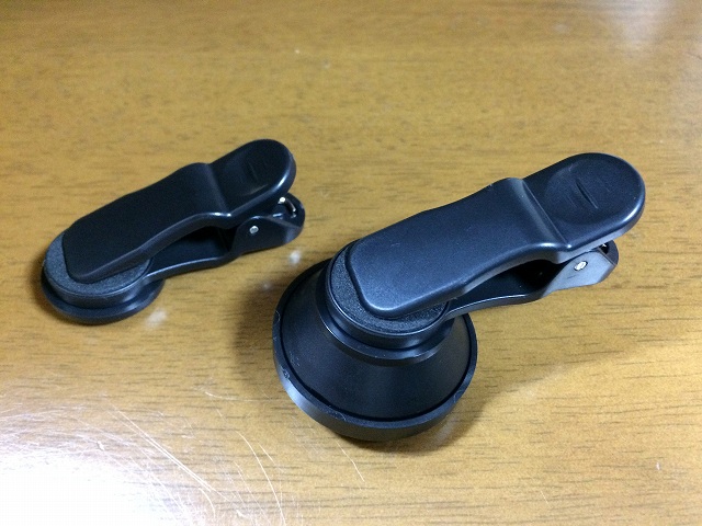 ひっくり返すとキラキラしてますね。そうですレンズなのです。洗濯ばさみでスマホを挟んで使います。左がマクロで、右が広角レンズです。広角レンズは自撮り用として売られていました。