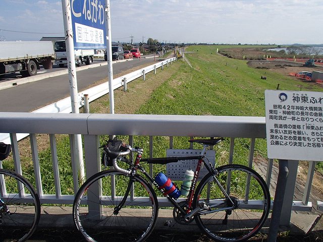 今日は北西の風だったので追い風に乗って超特急です。神埼大橋の側道を左岸に渡って目的の「昭和の名車大集合V」開催場所に到着しました。(BoostさんのジャージもSUBARU360!)