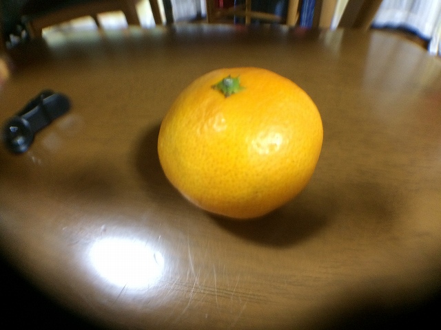 さっきのみかんを同じ距離から広角レンズで撮ったらこんな感じです。さっきは写っていなかった範囲が写ってますね。さすが広角レンズです。ちょっと光が変な感じですがおもちゃとしては面白い。