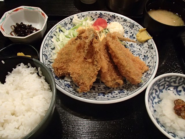 今日はアジフライ定食(600円)にしました。付け出しもあって、アジフライが4匹も付いていてコスパ最高で美味しかったです!!