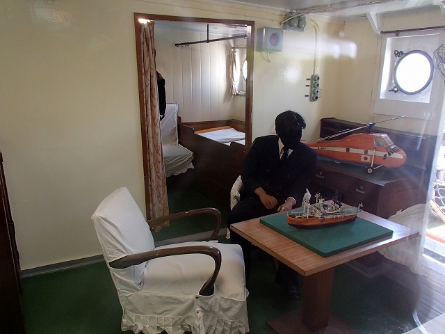 中に入ってすぐにあった部屋は「航空長室」のようで、空からの観察(ヘリコプター)は重要な任務だったんですね。奥に見えるベッドが小さいような気がしますが、180センチあるそうです。それにしても航空長はコナン君の犯人像みたいで怪しい(笑)